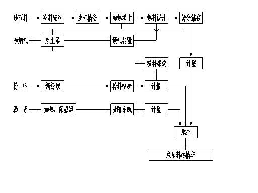 整机包括冷料配料输送、加热烘干、沥青供给、粉料供给、计量搅拌及排风除尘等主要功能系统,其工艺流程原理见图1-1: